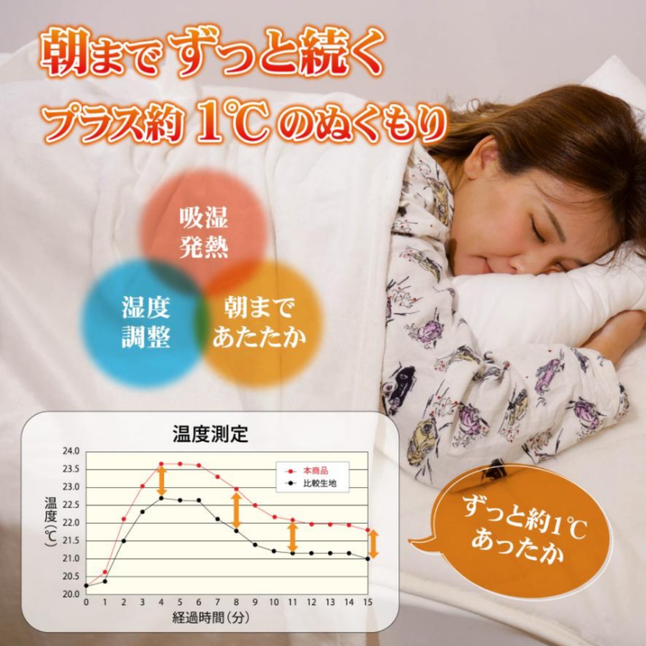 体から出る湿気を吸収して発熱し、冬の寒さを和らげます。寒い朝も暖かさに包まれて快適!